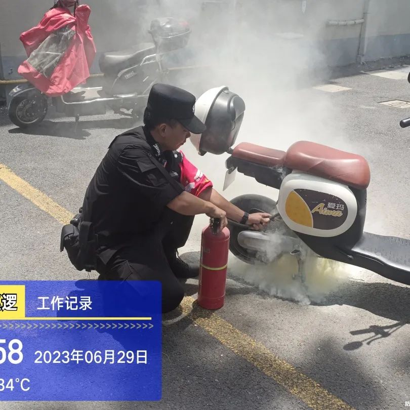 6月29日中午,一辆电动自行车在正兴堂弄小区车库内突然冒烟。接到警情后,拱墅安保集团队员孙二呆、刘松、孔德丽和高营武在2分钟内火速赶到现场。用巡逻电动车上的灭火器迅速将正冒着刺鼻白烟的电动车上的明火扑灭,仅仅用了不到4分钟的时间迅速排除了险情。为了从根源切断起火点,队员又对电动行车进行仔细的检查,发现电动自行车自燃的原因是电池老化。几名队员又紧密配合,将损坏的电池拆除,彻底消除了安全隐患,防止了车库内其他车辆的连带燃烧。