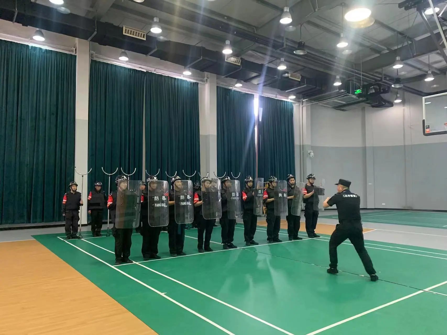 在蜀山基地、大华富阳生产基地,督教部组织开展了反恐防爆实操演练,讲解了钢叉、盾牌等防暴器械的功效及正确使用方法,五人一组开展实操演练。