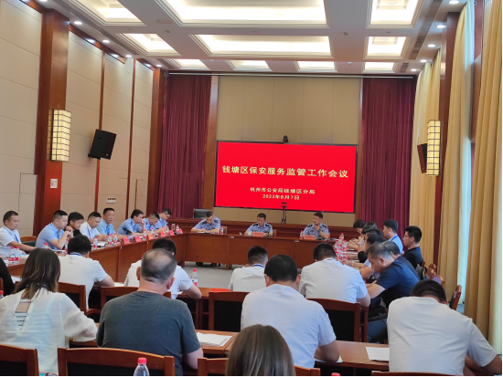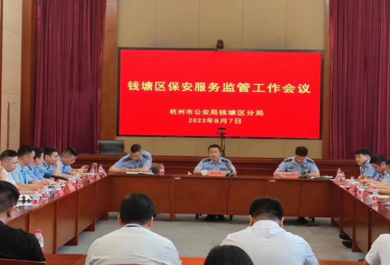 2023年8月7日,浙江盛安保安服务有限公司参加了钱塘区分局组织召开的“钱塘区保安服务监管工作会议”,会议由分局党委委员、副局长潘亮亮、基层基础管理大队副队长章佳彬、辖区各派出所领导、各保安公司领导参加。会上,公安领导介绍了钱塘区保安服务单位基本情况,并通报了保安服务检查中发现的问题和对安保从业单位处罚情况。会上提出了“保安员治安管理工作职责指引” “保安从业单位自查清单”,希望全区保安服务单位以亚运安保为契机,认真做好如下工作: