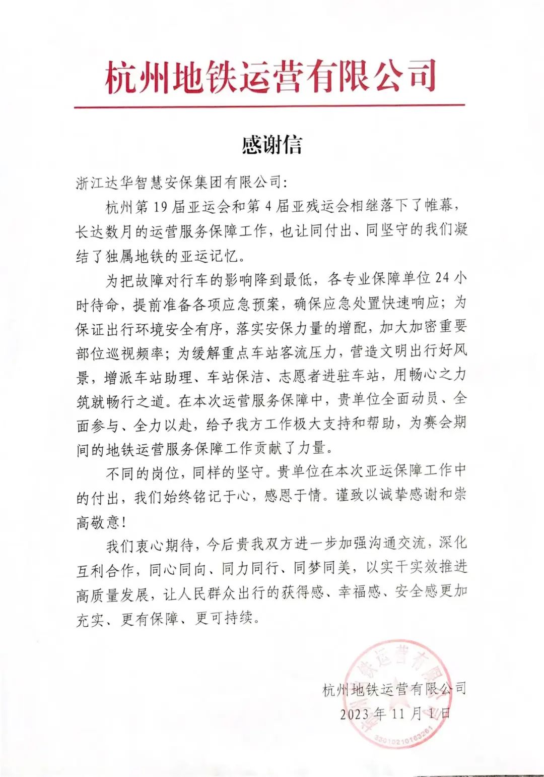 达华智慧安保集团地铁团队勠力同心、艰苦奋斗,圆满完成亚运地铁安检安保各项工作,集团和多位个人荣获了杭州市公安局地铁公安分局、地铁集团党委、杭州地铁、杭港地铁的各项表彰与嘉奖。