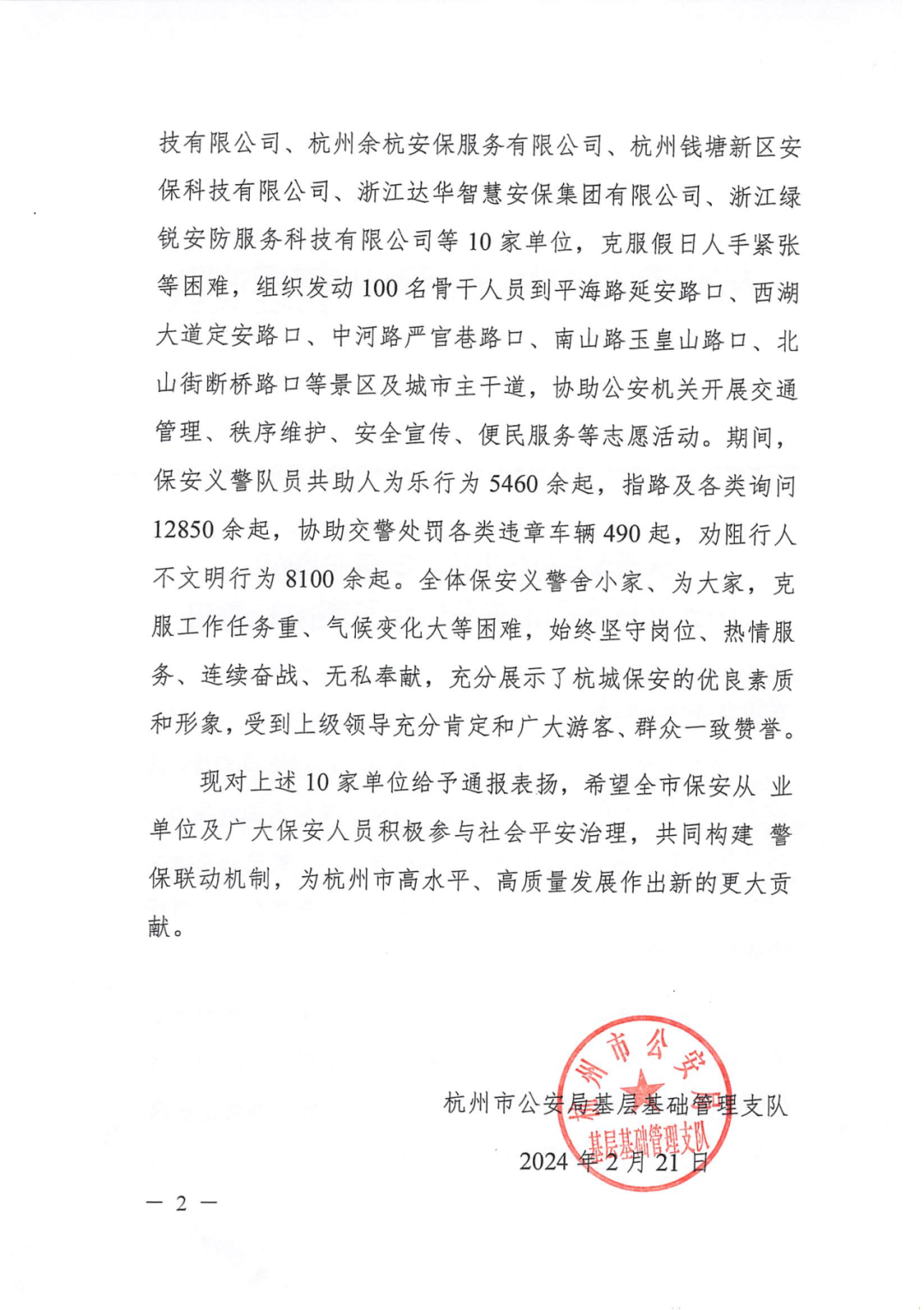 达华“义警红”们积极参与社会平安治理、共同构建警保联动机制、以生动的安保实践勾勒出一道亮丽火红的杭城风景线,获得了人民群众的广泛称赞和杭州市公安局双基支队的通报表扬。