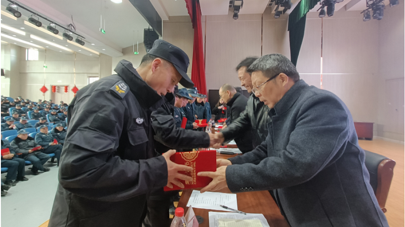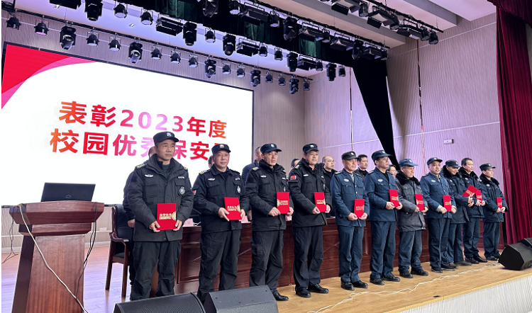 保安公司保安部教导员邱旭斌主持开班仪式,现场表彰“2023年度校园先进保安员”并颁发荣誉证书。