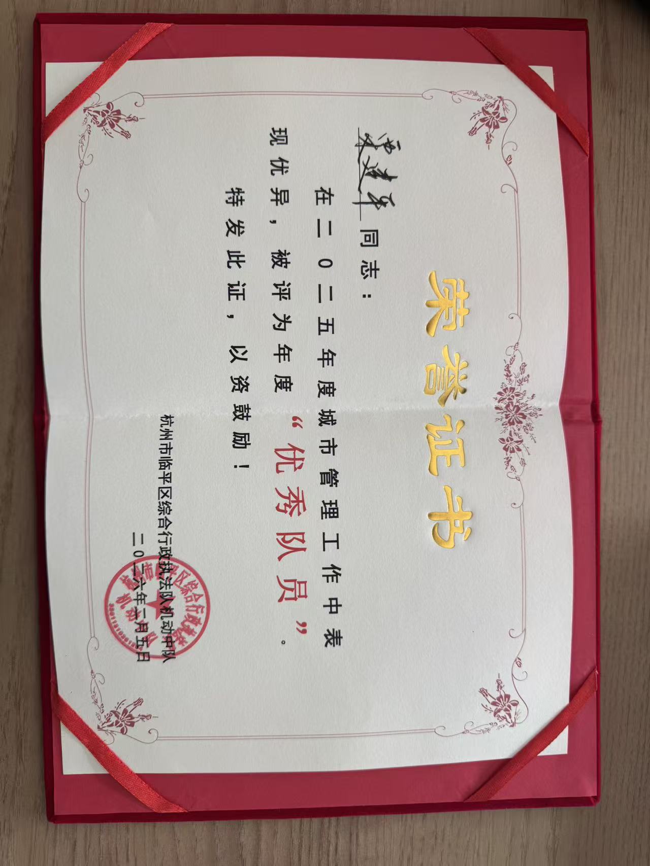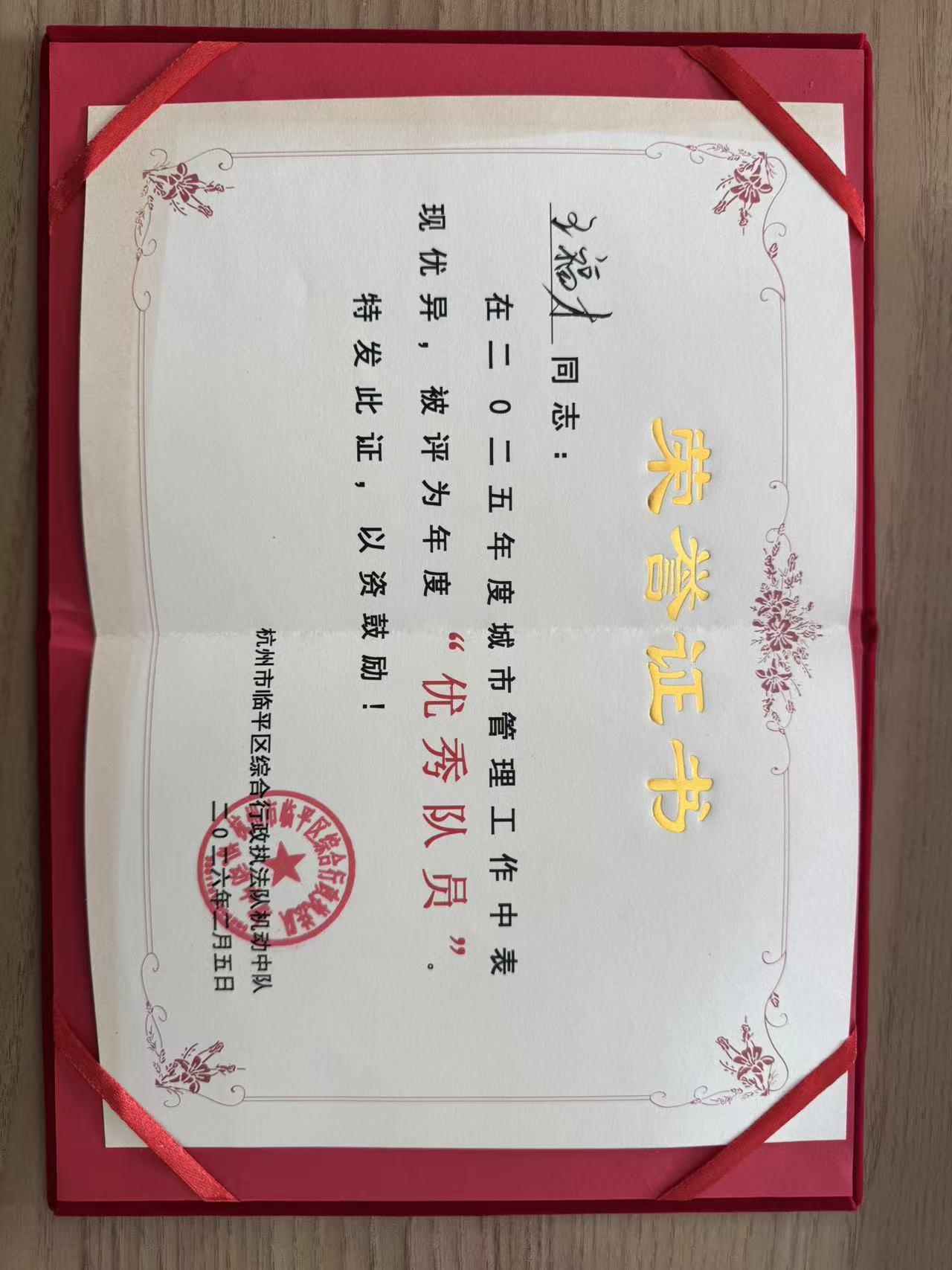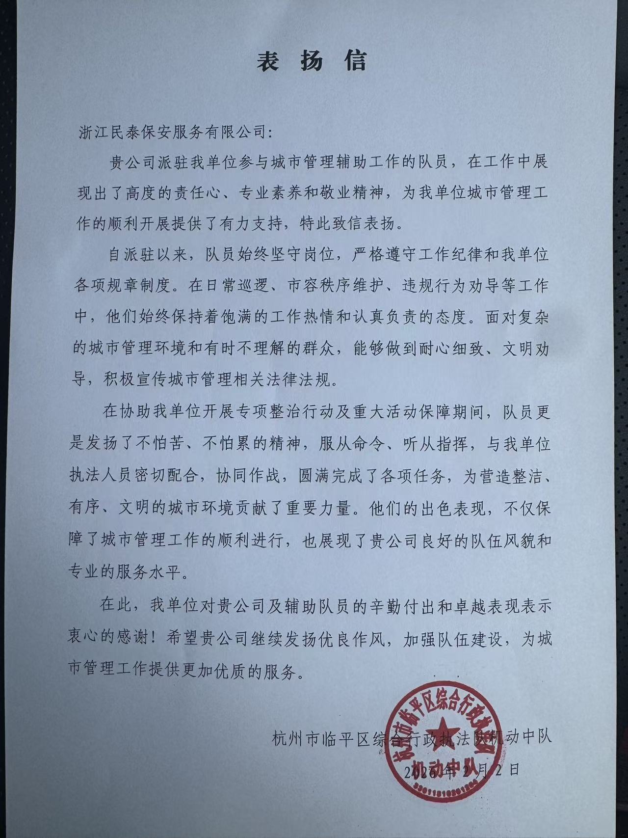 2月2日,浙江民泰公司收到杭州市临平区综合行政执法机动中队的表扬信,信中对公司派驻参与城市管理辅助工作的队员,在工作中展现出了高度的责任心、专业素养和敬业精神给予充分肯定。特别是王福才、栗建平两位同志被评为年度城市管理“优秀队员”。