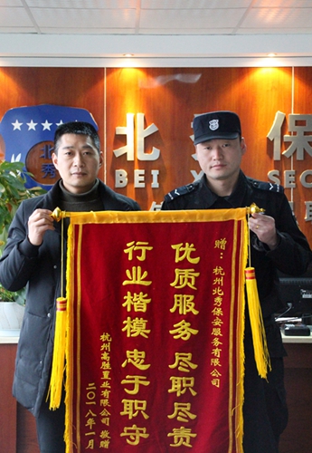 2018新年伊始,杭州北秀保安服务有限公司就收到了一面杭州高胜置业有限公司送来的锦旗,锦旗上写着“优质服务,尽职尽责,行业楷模,忠于职守”。