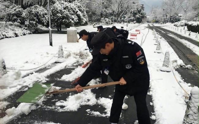 1月25日起, 杭州市普降中到大雪乃至暴雪,杭州市安保服务集团有限公司保安五部连续奋战3天3夜,全力迎战冰雪、保畅救援,确保各客户单位未发生一起伤亡事故。在这场抗冰雪保畅通的战斗中,保安五部全体安保人员发扬特别能吃苦能战斗的精神。特别是派驻到高速杭州支队的全体安保人员,因连日降雪和持续低温,造成路面结冰情况极其严重,给过往车辆及司乘人员生命财产安全造成了极大威胁,他们在连续10几个小时的扫雪铲雪工作中无一人退宿,成为严寒中的“铁人”,大雪中,高速执勤特别危险,队员廖胖为在执勤时拆除事故车辆受伤,他用实际行动护卫着辖区道路交通安全、温暖着过往百姓的心。