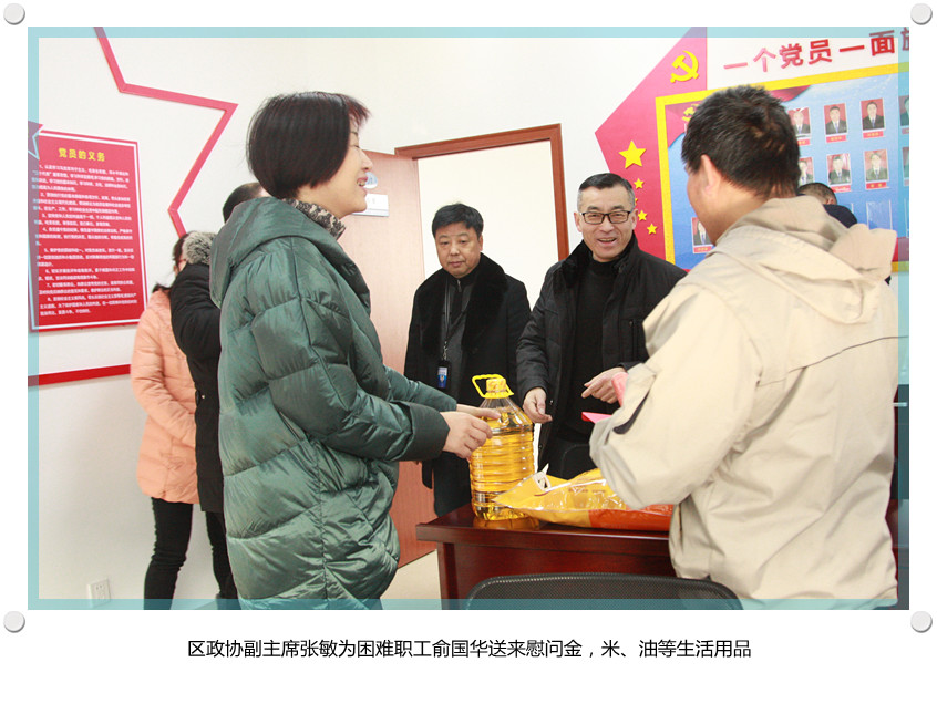 严冬显寒意,慰问暖人心。2月2日,随着新春佳节的到来,区政协副主席张敏、区人大办公室王力、区总工会党组成员帅新永等一行亲自前来我公司看望慰问建档困难职工,为他们送来了慰问金,米、油等生活用品。公司总经理赵南跃,副总经理陈铁军、工会主席崔保华等陪同。