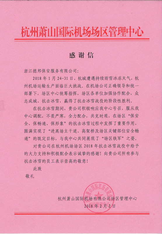 2018年1月24-31日,杭城遭遇持续雨雪冰冻天气,杭州机场运输生产面临巨大挑战。浙江德邦公司驻萧山机场保安队积极响应机场公司号召,服从中心调配,不畏严寒,在场区“保安全、保畅通、保形象”的抗击冰雪过程中发挥了重要作用,圆满实现了“进离场主干道、高架桥及场区关键部位安全畅通”的既定目标,与机场管理中心共同展现了“场区铁军”之姿。2月2日,杭州萧山国际机场场区管理中心发来一封感谢信,对浙江德邦保安公司及参加抗击冰雪的保安员们表示诚挚的感谢。