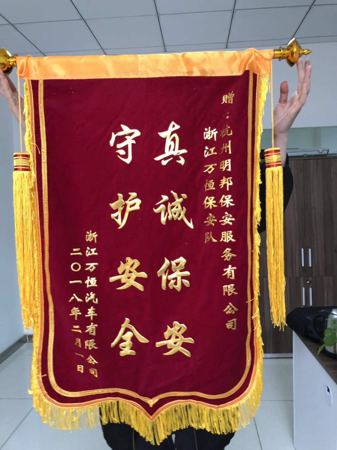 2018年2月1日公司驻万恒汽车有限公司领导亲自到保安室将一面写有“真诚保安,守护安全”的锦旗送到我司保安员手中,感谢我们保安兄弟入驻以来的默默守护及细致入微的服务,着实解决了客户单位的后顾之忧。