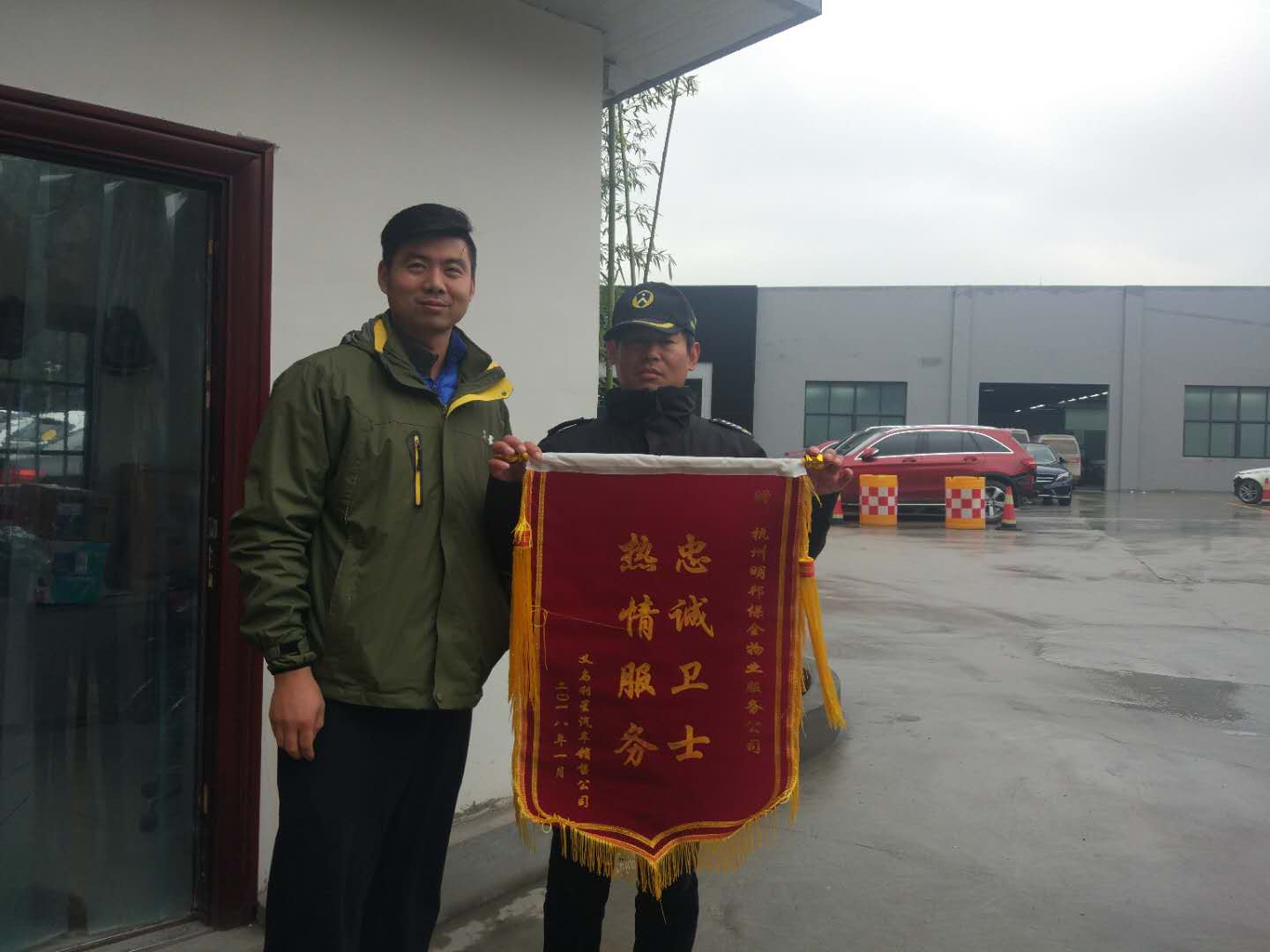 2018年1月31日公司驻义乌利星销售公司执勤点收到甲方领导送来的锦旗,该驻点紧邻娱乐场所,属于情况复杂,案件多发的地带,已经连续换了两家保安公司,还是事故不断,被社会上不良人员及醉酒人员刮擦损坏碰撞车辆数不胜数,每年累计损失高达上百万。