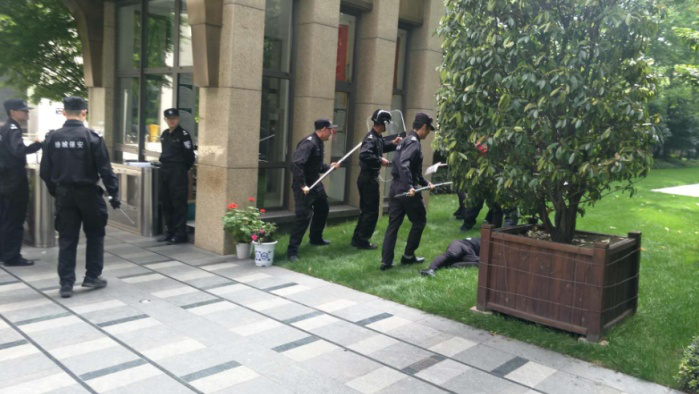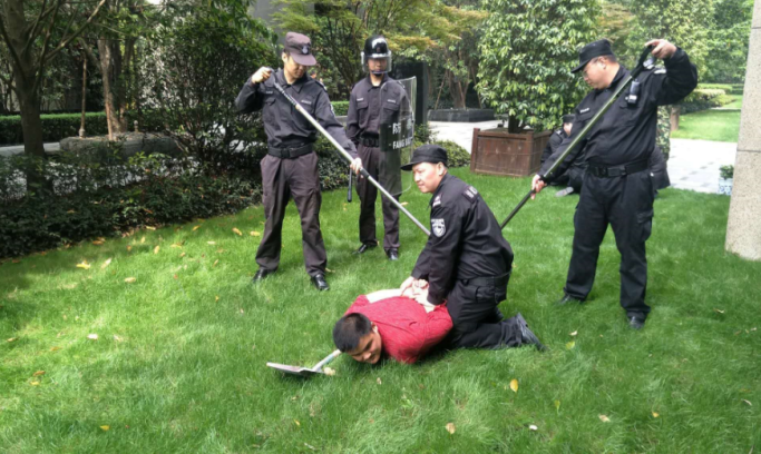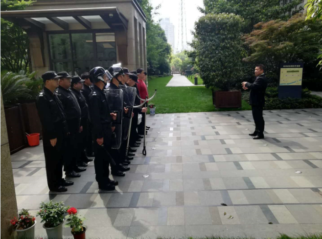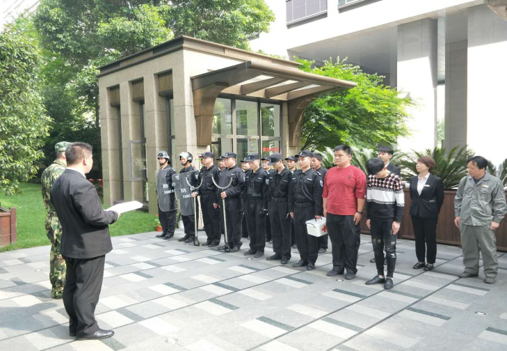 2018年5月2日9点,各保安队小组演习人员在武林国际项目凯旋门集合完毕,向总指挥汇报后,总指挥下达反恐防暴演习指令。