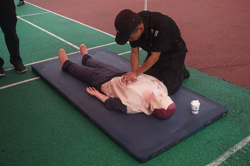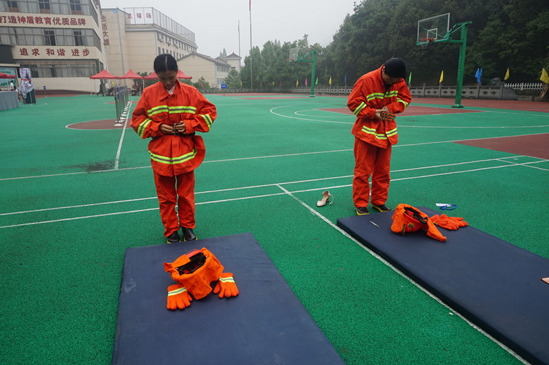 比赛现场,学校操场被分为几大区域,比赛人员按项目分组,依次进场比赛。十秒左右跑完4*10折返跑、三十秒内穿脱消防服、四分钟内完成徒手成人心肺复苏……看似简单的项目却考验着参赛者对技能的掌握程度和熟练程度。