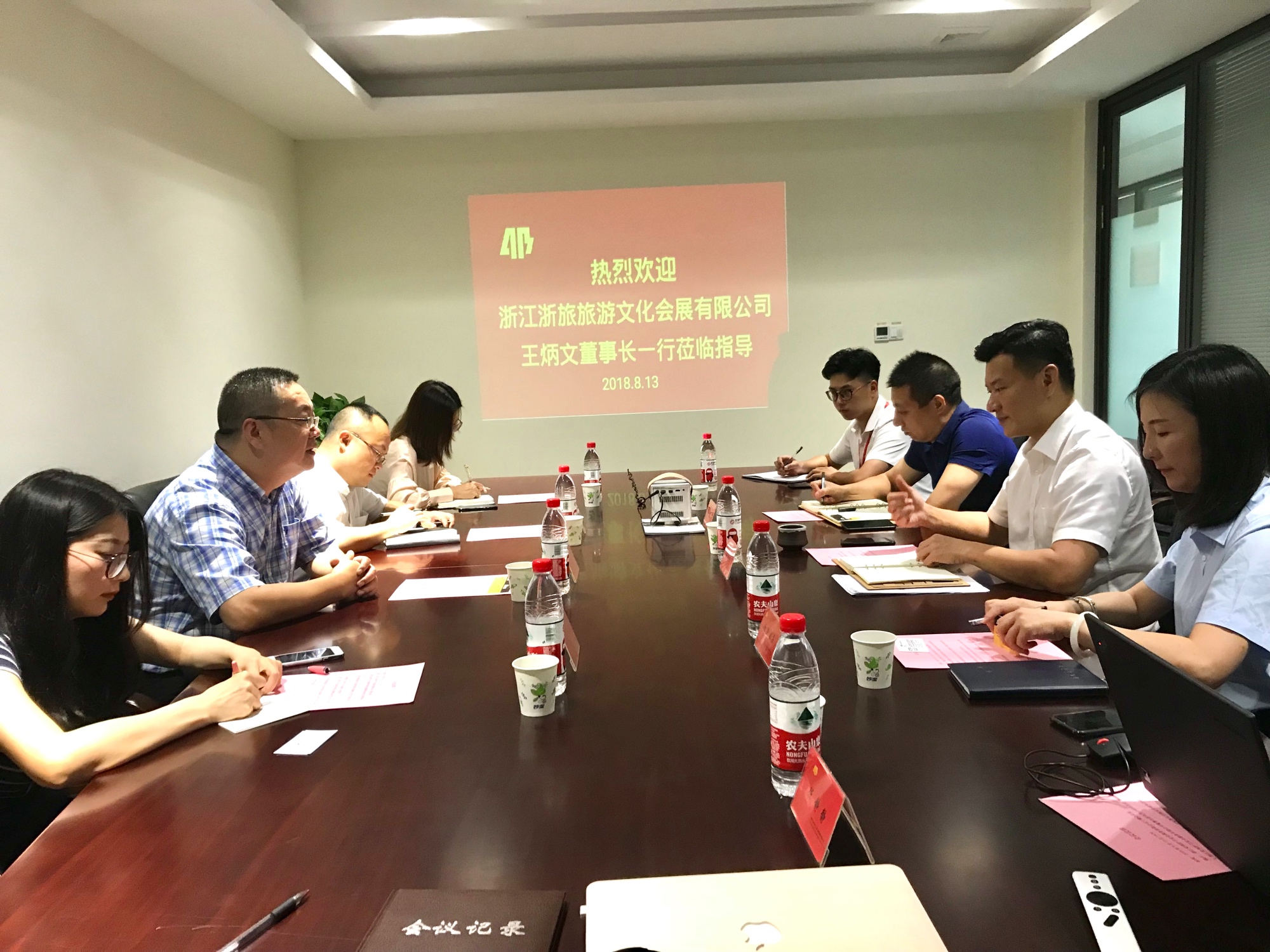 8月13日下午,浙江浙旅旅游文化会展有限公司董事长王炳文一行4人到访公司。双方举行业务对接工作会议。公司董事长涂克杰及相关人员参加会议。