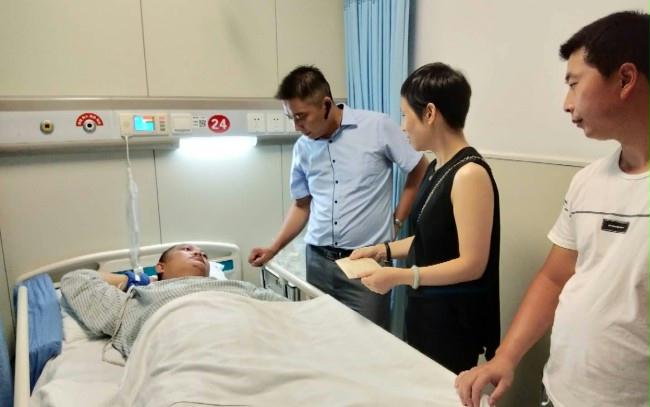 2018年8月24日下午,杭州市安保服务集团有限公司工会主席谢晓萍带领保安二部经理助理戚玲丽、中队长崔正银、班长肖岑,代表公司前往中国人民解放军第117医院,亲切看望慰问工作中突发疾病的保安员蒋军,并送上了慰问金,感谢他坚守岗位、认真负责,为维护客户单位秩序付出的艰辛努力。转达公司领导对一线保安员的亲切关怀。嘱咐他安心养病,并祝福他早日康复。