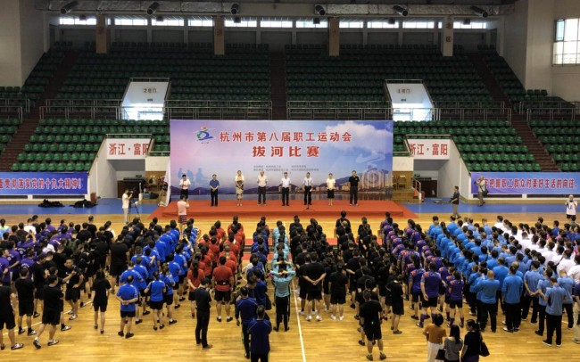8月27-28日,由杭州市总工会、杭州市体育局联合主办,富阳区总工会和富阳区旅游体育局承办的杭州市第八届职工运动会拔河比赛在富阳区体育馆举行。来自杭州各区县(市)、开发区(集聚区)总工会和产业工会近20支代表队伍共350余名选手参加了比赛。