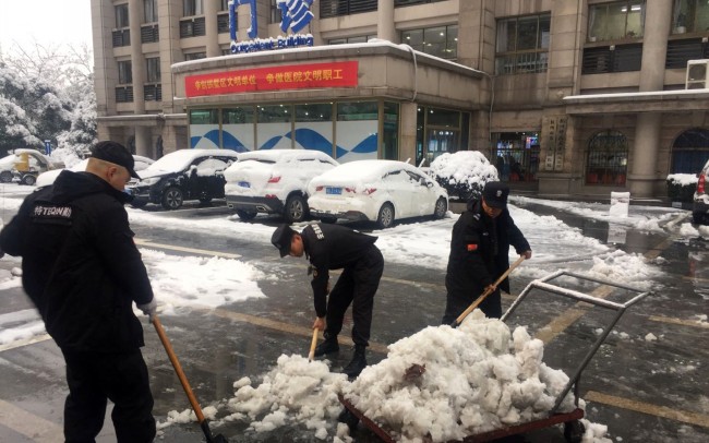 三、企事业单位:9日凌晨,城西银泰城、君尚金座、乐佳国际大厦、临平银泰、万科桂苑、旭化成氨纶、烟草市公司、杭州卷烟厂立即启动24小时应急值守制度,清雪机械与工作人员紧密配合,分工明确、责任到人,各执勤中队扫雪保安员按照”以雪为令、随下随清、扫雪除冰保畅通”的标准,认真履职尽责,迎风雪、战严寒,大家以高涨的热情,齐心协力,手持铁锹、扫帚、推板等工具,认真清扫责任区域积雪,以实际行动为客户安全出行、通畅出行保驾护航,使各执勤点又见最美的“黑白分明”。
