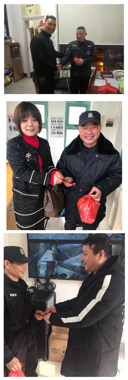 慰问组向春节期间仍坚守岗位的一线保安员们送去了新春红包、慰问品以及新春祝福。在慰问过程中,慰问组一方面对慰问的保安员的前期工作给予充分肯定,对他们作出的努力及贡献给予好评,另一方面勉励他们继续发扬良好的工作作风和保持高昂的精神面貌,影响及带动其它保安员共同努力,把关怀送到每位员工的心中、手中,对大家春节期间仍坚守工作岗位表示感谢,同时转达公司对他们远在异地家人的问候。