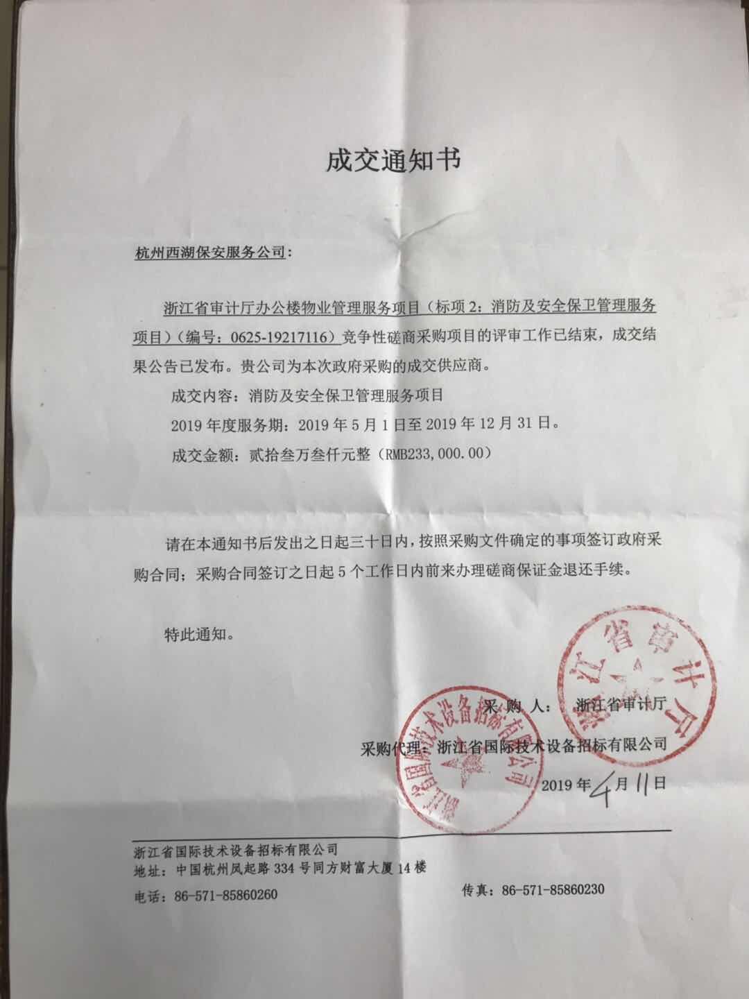 浙江省审计厅2019年保安服务项目公司领导十分重视。经支部陈书记等领导专门拜访及深入沟通,部门员工团结协作、共同努力,高效率、高质量完成投标文件的编制后成功中标。