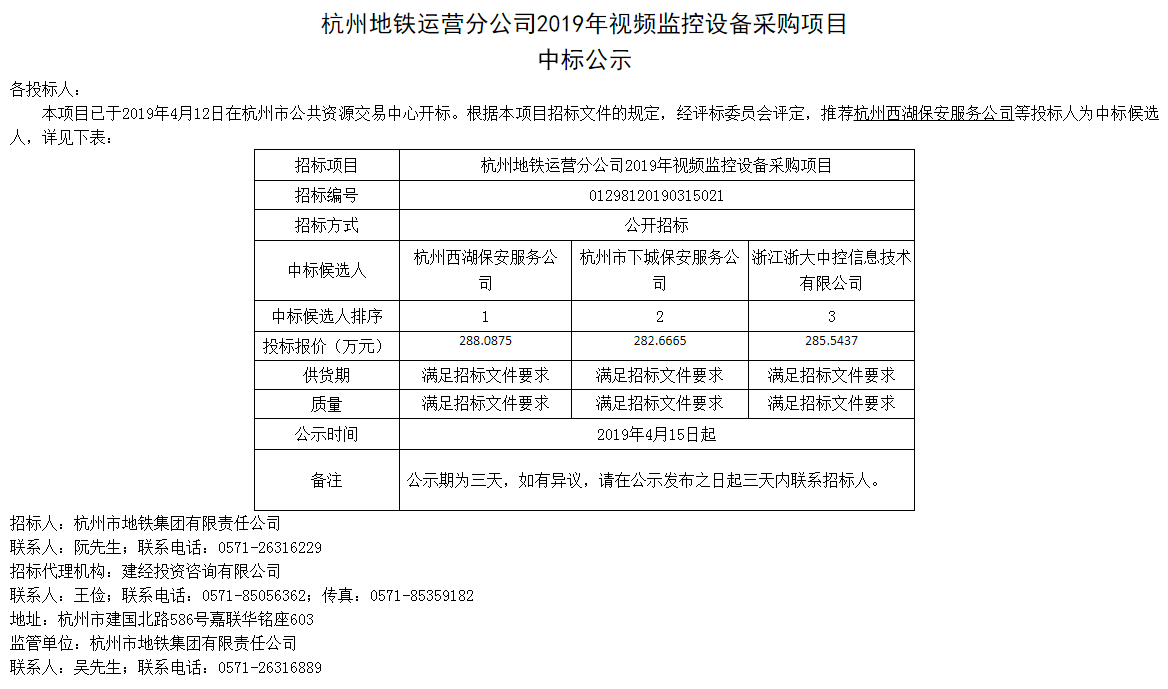 近日,杭州西湖保安服务公司招投标工作,凭借丰富的施工经验、扎实的技术力量和良好的信誉,一举拿下杭州地铁视频监控采购项目和浙江省审计厅2019年保安服务项目两个重要招标项目。