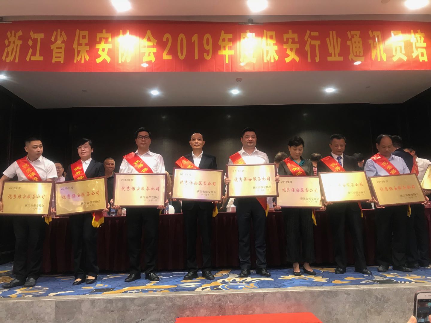 2019年5月10日,浙江省保安协会在杭州召开2018年度优秀保安单位、保安个人表彰大会,浙江省保安协会会长何建军、公安厅治安总队副总队长沈秋伟、保安协会监事长徐薛明,副会长陈珊军、章伟达、王晖、黄云华、及秘书长王文骅、副秘书长夏国锋等领导出席。 公司荣获“浙江省优秀保安服务公司”殊荣。同时,公司盛侠同志被评为“2018年度浙江省优秀保安员”。大会向获奖的优秀单位及优秀保安员代表颁发了奖牌和证书。