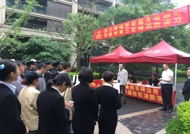 2019年5月13日下午15:30时到16:30时,浙江绿城保安服务有限公司田园牧歌保安队组织了消防演练活动。田园牧歌物业服务中心工作人员和保安队员联合业主、街道和消防部门领导共计60人参加了演练。培训和演练一共历时1小时,演习紧张、有序进行,并取得圆满成功。