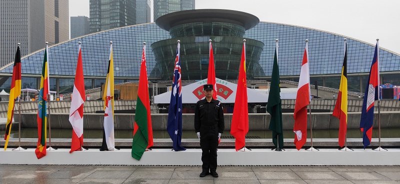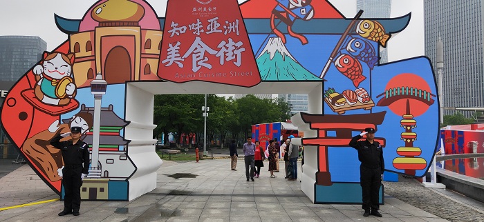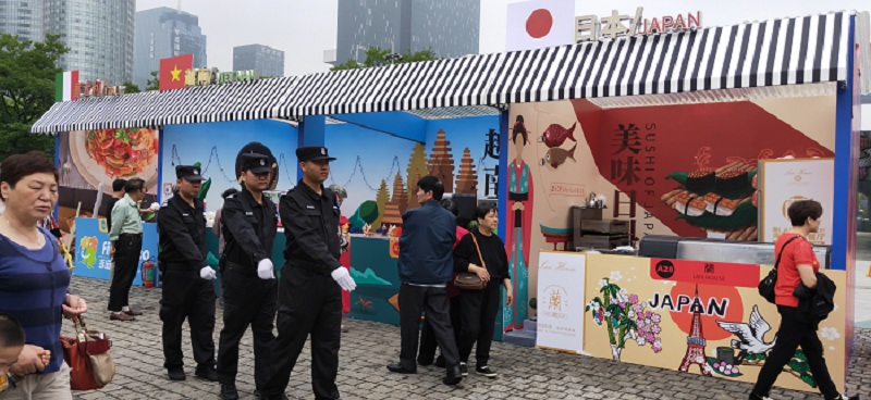 美食节从15日开始持续至19日结束,共计有来自世界各国的412个美食摊位。浙江绿城保安服务有限公司城市阳台保安队为此次美食街保驾护航。从14日开始70多名保安队员就开始协助主办单位搭建商铺摊位,美食节期间在各个岗位出入口、停车场、灯光秀广场执勤守卫,安全管控,确保游客进出人流平稳顺畅、井然有序,保障游客人身安全及维护现场秩序,直至大会结束。