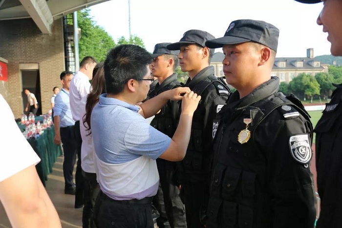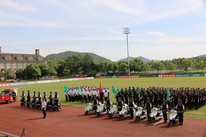 为积极响应省公安厅治安监督管理总队关于在全省开展“保安勇担当,平安迎大庆”主题活动的号召,深入贯彻政府对安全生产工作的重视,全面推进保安服务行业风险隐患排查,广泛动员保安从业人员积极参与新中国成立70周年大庆安保工作,进一步提高保安队伍的整体素质,提高全体队员比、学、赶、帮、超的工作氛围,为员工在岗形象打下扎实基础,铸就一支一流的铁军队伍,以期以优良的服务品质更好的服务业主,浙江绿城保安服务有限公司于2019年5月29日举行了以“勇担当、练精兵、保平安”为主题的安全工作大比武。