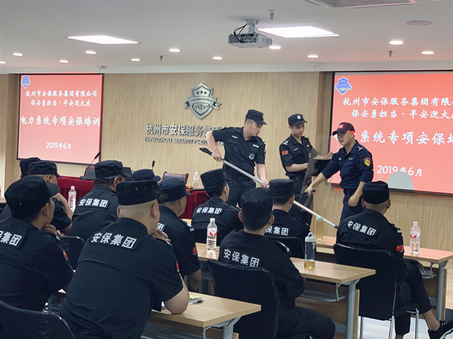 为了更好履行电力系统保安职责,维护电力网点安全,全面提高电力网点保安员整体素质,加强保安服务质量,以更好的精神面貌迎接新中国70周年华诞,积极响应 “保安勇担当 平安迎大庆”主题活动的号召,2019年6月2日下午,公司专门针对派驻在全市电力系统保安精英团队进行了专项在岗工作培训。培训特邀请了杭州市公安局经文保支队刘刚大队长做电力安保守卫重要性指导、杭州市人民警察学校训练一大队张晓翔教官反恐防暴技能讲解、公司郑小华经理对电力安保业务做规范化授课、市电力安监部温秀峰做电力安保要求培训。公司驻电力系统130余安保精英参加本次培训。公司以提升技能的安保培训“实战”正式拉开帷幕。