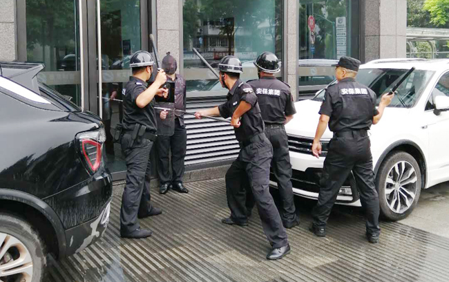 绵绵细雨的午后,三名蒙面歹徒携带刀具突然窜入大楼门口,大楼保安立即发现并第一时间用对讲机向当班保安主管汇报,随即保安主管马上向物业主管领导汇报,主管领导得知情况立马启动预案,各应急小组全部迅速到位。