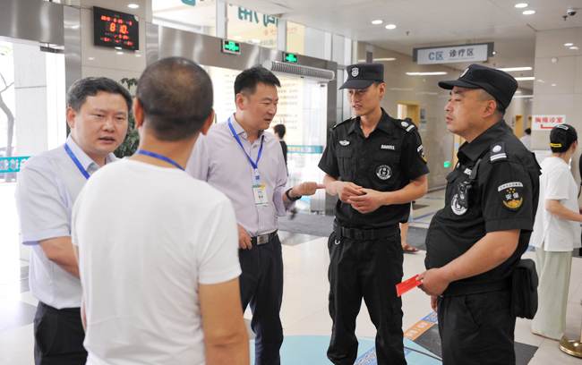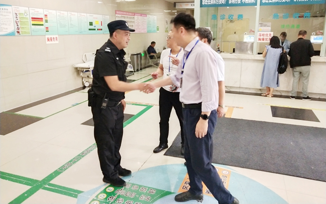 6月21号晚上23:10分,丽水市人民医院2号楼1楼走廊漏水,在大雨中执勤的刘守雷同志接到通知后,迅速反应,第一时间赶到积水处,不顾是否有危险,将手伸入积水深处掏出被雨水冲入的杂物,有效处置了积水,化解了险情。解决完险情,刘师傅打算继续检查别处积水情况时,由于路面湿滑抢险中不慎摔伤。6月26早上,纪委书记陈一军,院办主任叶世伟,保卫科长蓝宏伟代表院方来到急诊慰问和表扬并嘉奖了刘守雷同志。