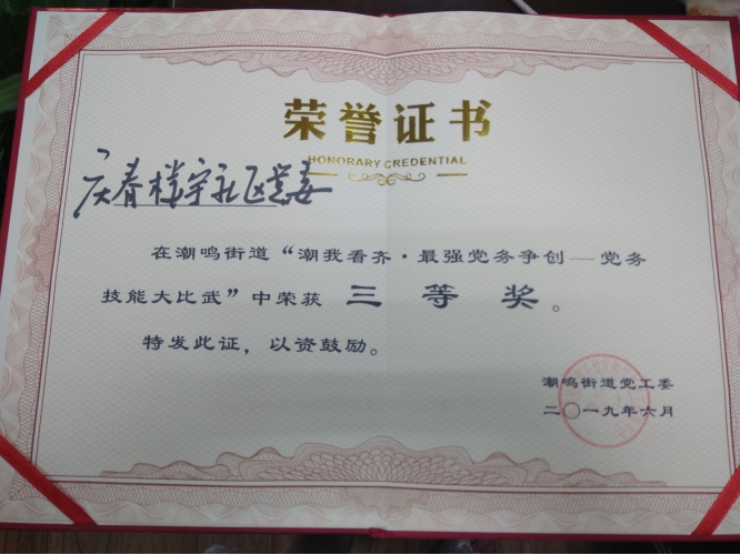 2019年6月27日潮鸣街道党工委为纪念中国共产党建党98周年在党的生日来临之际在宝善宾馆举办的“潮我看齐 党务技能大赛”正式开赛了,来自潮鸣街道各社区党委共计15支队伍参加了这次党务技能大比武的活动,公司党支部书记陈凤瑛同志加入庆春楼宇社区党委的团队代表庆春楼宇社区党委参加了此次党务技能大比武竞赛活动,陈凤瑛同志和庆春楼宇社区党委队员们通过自身过硬的党务知识和稳定出色的发挥从线上赛一路角逐晋级至线下赛,最终代表庆春楼社区获得此次比赛的三等奖。