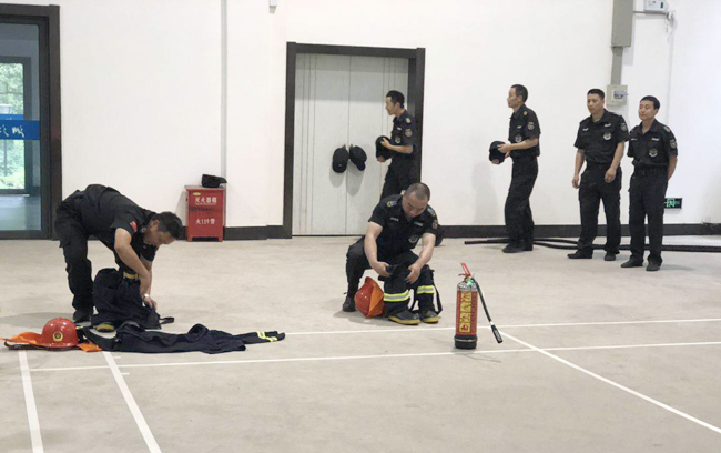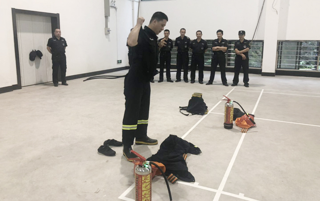 比赛正式开始,队员模拟实际火灾现场,从快速穿戴消防服到使用电子灭火器成功灭火,以耗时最短,动作最为标准为冠军。各位队员踊跃参加、操作娴熟,你追我赶,不亦乐乎,经过比赛,最终保安员孔祥振以用时最快,动作最为标准喜获冠军。