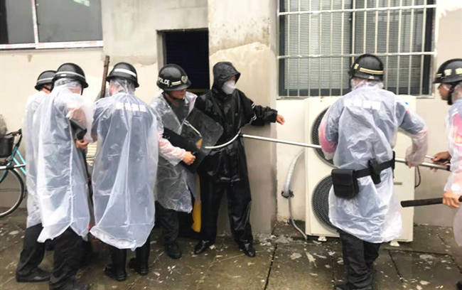当天上午8:00,受梅雨带影响,杭州发布暴雨黄色预警。公司驻点参训人员顶风冒雨,克服恶劣天气影响,紧扣当前反恐处突实际展开练兵,伴随着倾盆大雨,演练拉开帷幕,两名持刀歹徒冲到演练场中间,驻点处突小分队手持钢叉、盾牌、警棍与之拼尽全力进行搏斗,经过保安队员与歹徒进行多个回合较量,最终保安队员们将两名歹徒制服。演练结束后王伟书记对处突小分队在恶劣天气下的表现表示高度肯定,对演练中队员们敢打敢拼,真枪实刀的“真功夫”,队员的密切配合给予高度评价,并希望队员将这种勇猛善战的干劲,应用到实际工作岗位上,家再接再厉,不断提高技能,为九溪水厂安全的工作秩序保驾护航。