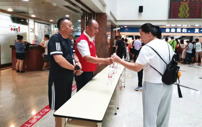 时值盛夏,高温炎热,活动现场,九名党支部成员身着红色马甲分散在医院人流密集区域,为患者提供维护排队秩序、办卡充值、就诊引导等服务,并为患者们送上一瓶瓶解渴的矿泉水,缓解他们就诊等候时的焦虑心情。虽然医院开有冷气,但是党支部成员们几乎一直在忙碌,协助出行不方便患者就医,帮年纪大的患者取号、引导…..汗水早已打湿了衣服,顺着脸颊流淌下来,但是他们毫不在意,随手抹一把汗,又开始热情服务下一个求助群众,他们热情、耐心的服务让看病群众感受到了党的温暖与关怀,得到了大家的一致好评。