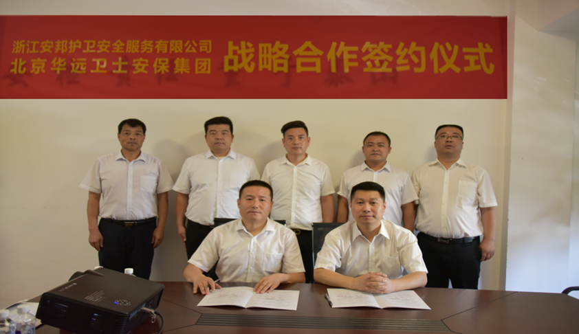 2019年7月23日下午,浙江安邦护卫安全服务有限公司与北京华远卫士安保集团举行战略合作协议签约仪式,公司董事长黄云与北京华远卫士安保集团总裁孙红玉出席仪式。根据协议,双方本着平等共商、开放共建、资源共享、互惠共赢的原则,将在安保教育培训、安保咨询评估、安防技术应用、人力资源外包、高端安全服务、海外安保服务等方面开展一系列的合作。