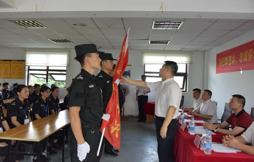 签约仪式后,黄云董事长、孙红玉总裁共同出席了双方合作开展的宁波安保项目基地的“践行新使命,忠诚保大庆”宣誓大会,为全体队员的宣誓进行了监誓并授旗。黄云董事长对宁波安保项目的工作给予充分肯定,并鼓励大家再接再厉,争创业内一流。