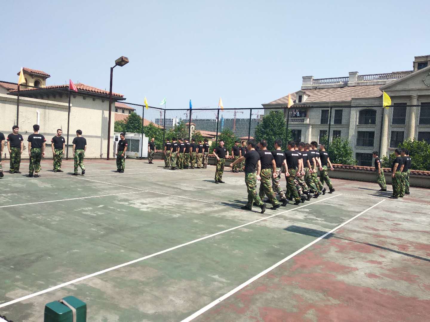 基于为70周年国庆营造良好的市场环境和社会氛围,充分发挥绿城保安队伍在维护治安稳定方面的重要辅助作用,根据入伏后的天气情况,公司依托内部“职工技能培训学校专业教官”资源优势,科学制定组织练兵计划和方案,各项目还邀请了公安分局教官进行现场授课。此次练兵内容除了保安服务条例规定的职责外,还包括延伸关系到业主、客户安全的消防,电梯困人救援,自然灾害救护等实操培训领域,从多方面,全方位的角度、有针对性的开展灵活多样的系统培训。在训练场地,热浪袭人,时不时传来阵阵呼号声、喊打声,队员们头顶烈日,刻苦训练,克服着持续“高燃”天气,演练过程中,雨水和汗水交织在一起,队员们像上满了发条一样牟足劲,愈练愈勇。