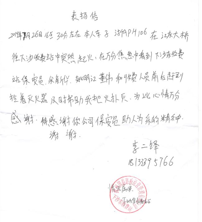 2019年7月26日下午16:30分左右,一辆车牌号为浙APH106的货车在行驶到绕城高速江东大桥往下沙收费站附近时突然起火,突发险情,使驾驶员手足无措,公司保安三部驻下沙收费站保安员余新华第一时间发现情况,没有丝毫犹豫,立刻和保安员姚明江、董伟及收费站工作人员拎着灭火器赶到,迅速处置火情,扑灭初起火灾,避免火势蔓延造成更大的损失。驾驶员李师傅非常感动,特意向公司手写了一封感谢信,感谢公司保安员助人为乐、不怕危险、关键时刻挺身而出的英勇精神......