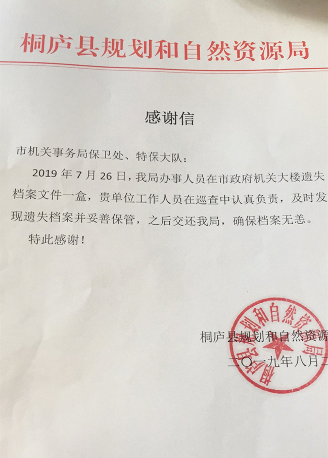 2019年7月26日下午,杭州市安保集团驻市民中心特保大队队员在例行巡逻至新业路中环处捡到印有“桐庐县规划和自然资源局”字样的一盒档案资料,但因无具体联系方式,只能将资料交至市机关保卫处。后市保卫处成功与失物单位取得联系,并及时将资料归还。