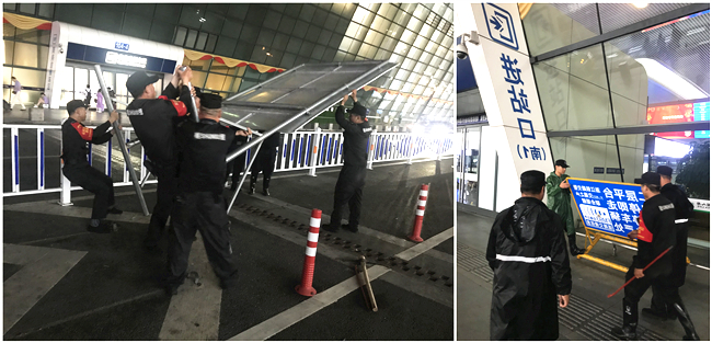 9日凌晨,驻火车东站保安员们正在将可移动的指示牌全部搬走,防止台风刮起,撞伤乘客。