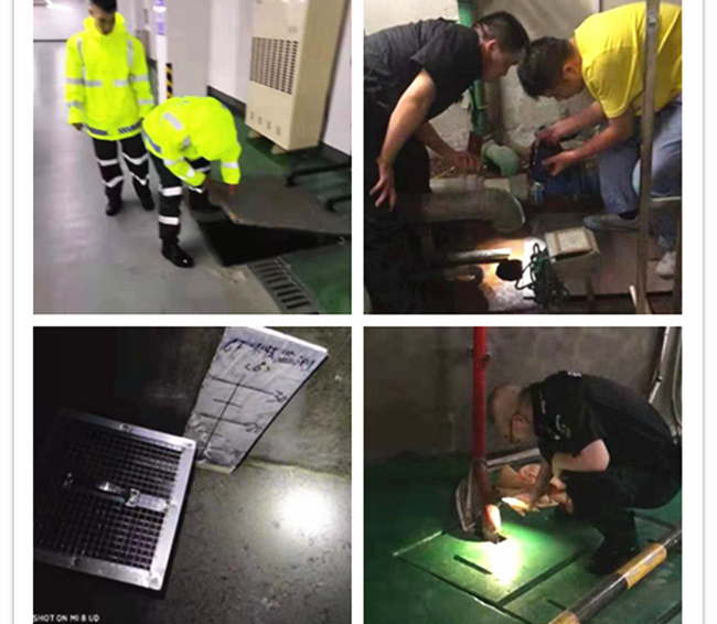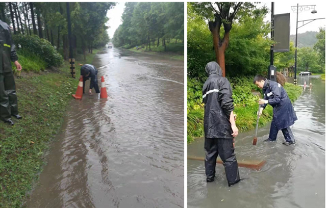 10日中午,萧山湘湖道路出现积水,安保队员们不顾危险,正在迅速查找问题源头,加速排水中。