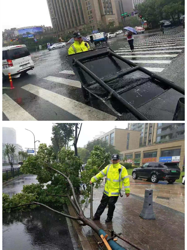 10日清晨,TPTU队员刘豫聪,巡逻发现被风吹倒的树木和交通指示牌倒在路面上,影响通行,顶风冒雨快速处理。
