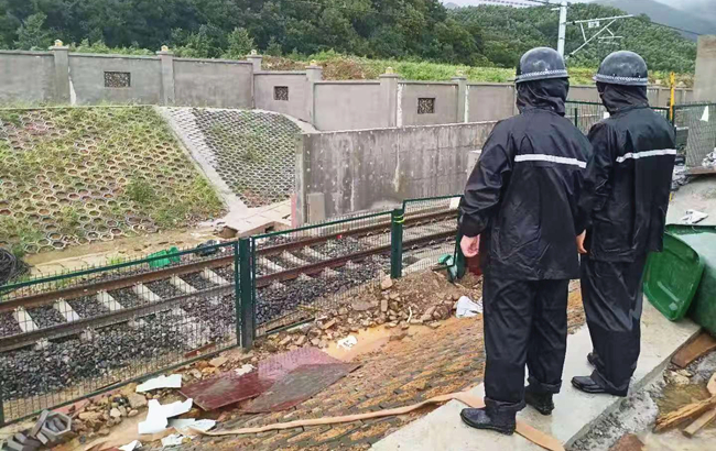10日上午,杭临轻轨上泉车辆段,试车线。队长闫雷,队员张先武在台风大雨期间巡查试车线轨道U型槽积水和有无滑坡。