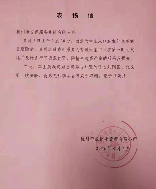 8月3日上午9点30分左右,公司保安五部驻西溪天堂保安员耿盼盼巡逻时发现园区内一辆小型汽车发动机突然冒起了浓烟,车主手足无措,为避免险情扩大,最大程度保护园区安全,队员耿盼盼立刻按照公司处置突发情况流程,第一时间通知园区指挥中心与其他队员,收到火情的队员蒋忠龙和李学君没有丝毫犹豫,立刻拎着灭火器赶到,迅速处置火情,扑灭初起火灾,避免火势蔓延造成更大的损失。紧接着值班班长对事故车辆进行警戒隔离,并安排队员对道路交通进行疏导,半小时后,拖车到达现场将车辆拖走,园区道路恢复正常。