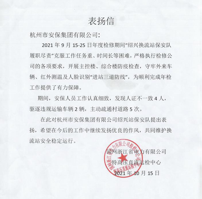 近日,杭州市安保集团驻绍兴流换站保安队收到了来自客户单位的表扬信。信中对年度检修期间保安队认真负责、细致入微、忠实履职的工作态度提出表扬。
