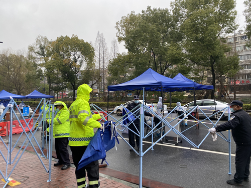 早上6:20,冬日的富阳天还未亮,参与疫情防控的富阳保安人已分别在5个核酸检测点集合到位,助力金桥社区抗疫。健康码查验、分发棉签、秩序维护......各核酸采样点检测正式开始后,志愿者们按要求开展工作,确保现场井然有序。期间,部分志愿者参加核酸样本运送,单人最高运送量达2710份。新的检测点确定后,志愿者主动加入帐篷搭建队伍,力求尽快完成现场布置。近两日,富阳早晨的温度跌至零下,还下起了细雨,志愿者们冷得直打哆嗦,手脚冻得通红,“冷是冷,但能为疫情防控献一份力,心是暖的”,“只希望疫情能早日过去,富阳能重新恢复正常秩序,辛苦一点不算什么”,每天需经过近5个小时的奋战,志愿者们才能完成检测点的工作。