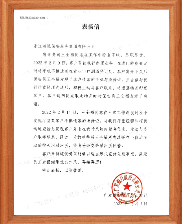 2022年3月1日,伴随着和煦的春风,鸿民保安公司接到了来自甲方单位广发银行发来的一封表扬信。来信中特意表扬鸿民保安驻滨江支行的队员王全福同志拾金不昧尽职尽责的高尚品德。信中着重举例出王全福同志在2月9日与2月11日两次,将拾获的手机、身份证等客户重要物品完璧归赵。特别是对于找不到失主信息的情况下,仍不抛弃不放弃,坚持将客户的重要证件转交至相关派出所,请求民警的力量协力帮助到失主将重要物件“失而复得”。