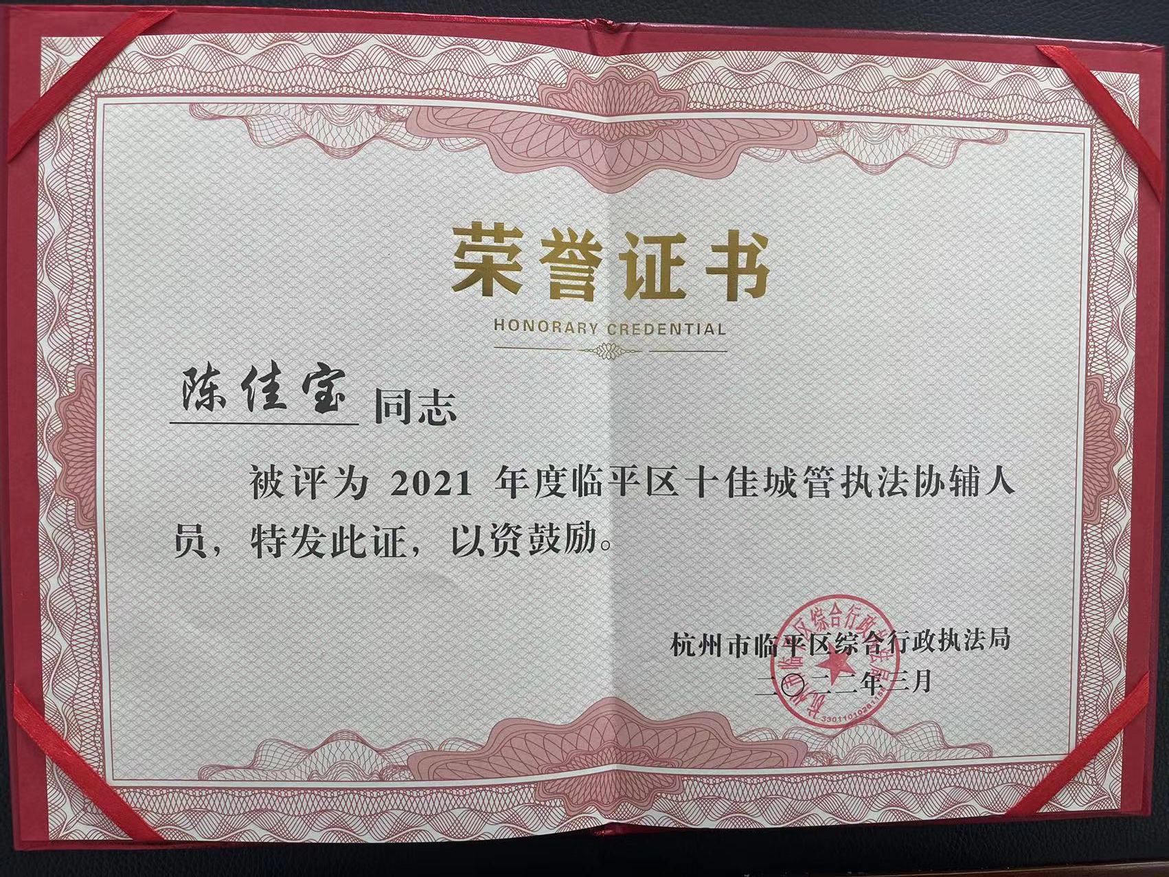 2022年03月14日上午10点,杭州市临平区星桥街道城管中队领导推选陈佳宝同志为2021年度临平区十佳城管执法辅助人员并亲自为陈佳宝同志颁发此证,此荣誉由杭州市临平区综合行政执法局颁布,相关领导充分表达了对陈佳宝同志在2021工作的认可,特发此证,以资鼓励。星桥街道项目基地负责人陈佳宝在过去的一年里,担任星桥项目队长以来,在工作中一直勤勤恳恳、兢兢业业,无论是配合甲方领导整治还是扣摊贩过程中,一直奋斗在第一线,对于领导交代的任务,完成的都相当出色,感谢星桥城管中队领导对陈佳宝同志的厚爱和对他工作成绩极大的认可。新的一年,新的气象。