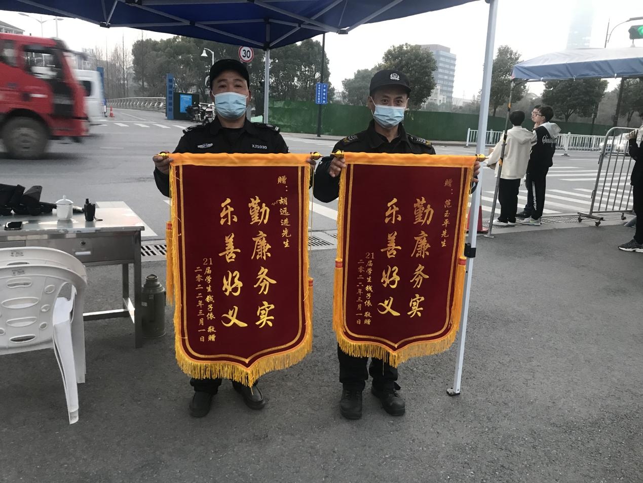 近日,杭州西湖安保服务集团有限公司驻浙江旅游职业学院执勤点的两名安保队员胡远进和范玉平收到了旅院学生钱子依的锦旗一面,上面写有“勤廉务实,乐善好义”八个大字。