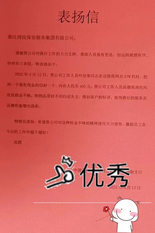“浙江鸿民保安服务集团有限公司,感谢公司对我行工作的大力支持,委派人员虽有更迭,但运转依然有序,针对员工表现,特表扬如下: