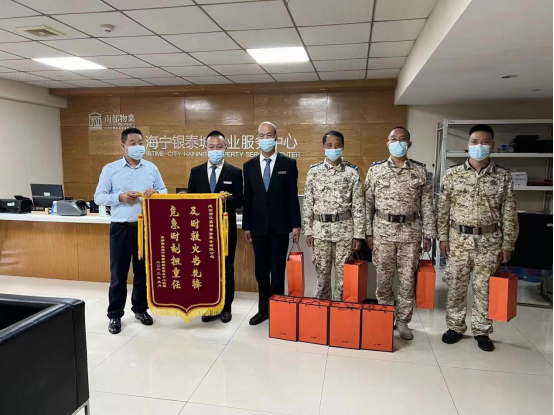 金泰城超市的领导接报知道此事以后,与银泰城的领导一起慰问了灭火英雄,并给浙江蓝剑安全服务有限公司送去了一面鲜红的锦旗。